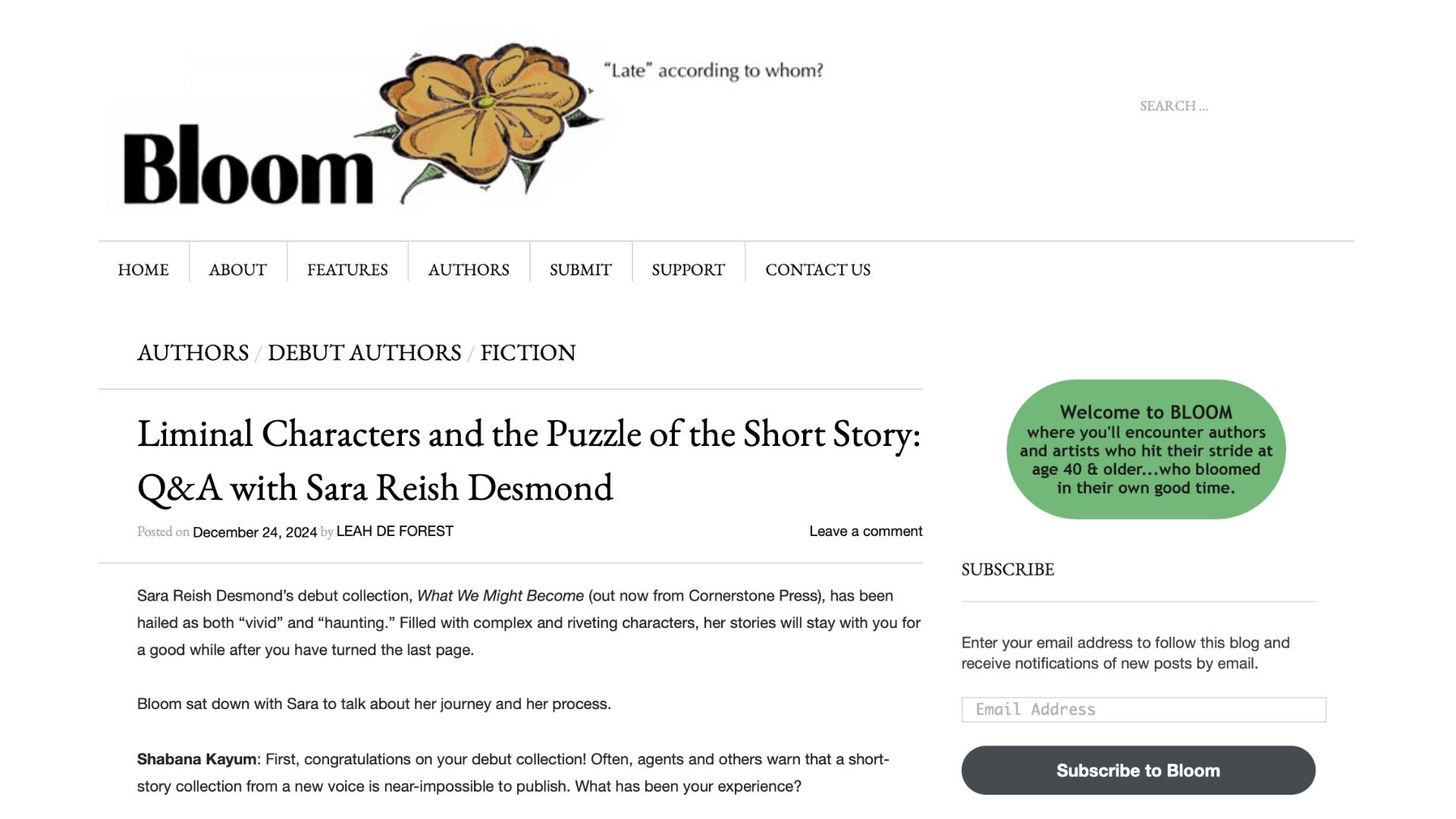 Read Sara’s interview about her process and collection at Bloom, an author platform for women writers who debut after the age of 40.