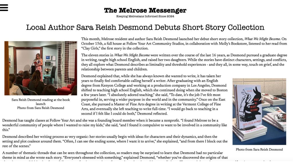 Sara speaks with local Melrose journalist, Ellen Putnam, about her writing life and debut story collection.
