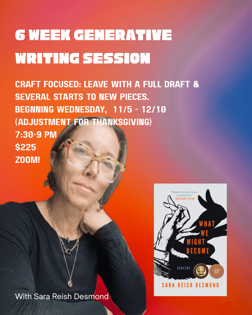 6 Week Generative Workshop, via ZOOM. Every week, writers will discuss an element of the craft, generate new work with related prompts and leave with an assignment for the following week. Participants will workshop a piece of up to 6 pages in length, leave with a complete draft, a path forward for revision and several new seeds for new projects. $225.